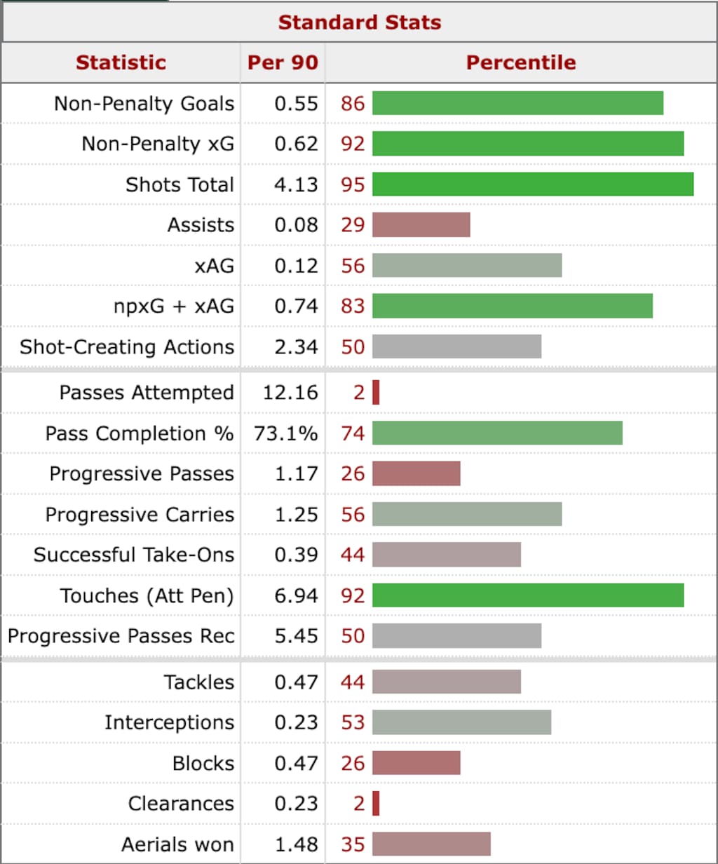 Spending the vast majority of his time on the pitch in the center of the park or the half spaces on either side, the 21-year-old is a pure goalscorer who loves to get into the right position to offer a killing blow in front of goal; as noted by his averaging 6.94 touches in the 18-yard-box/90min.