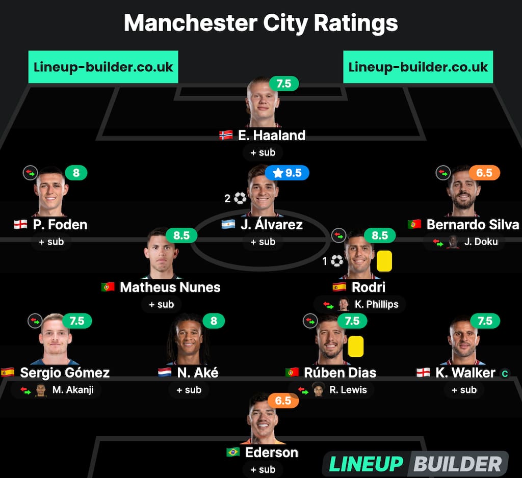 Despite Phil Foden and Julián Álvarez linking up well as play continued throughout the first half, star striker Erling Haaland was rather quiet and seemingly going through the motions, with the balance of positive play stemming from the England and Argentine international midfielders which aided in Rodri’s ability to galavant forward into more advanced positions.